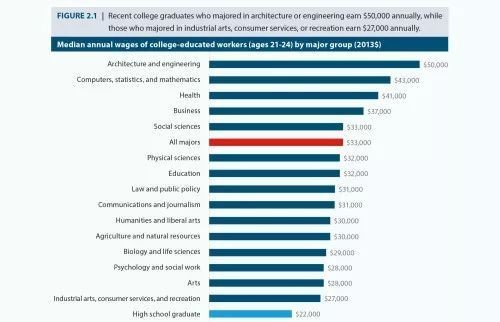 University教育与就业中心2018年的数据,可以看出21到24岁毕业生(基本上就是应届毕业生)的工资中位数中,建筑及工程方向的薪资最高($50k),紧接着是计算机,统计及数学($43k)。商科和医学方向学科算是非STEM专业里工资较高的了。